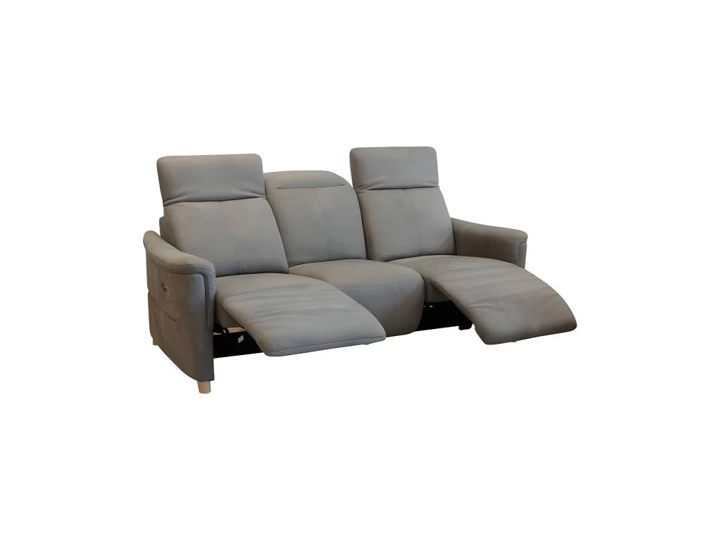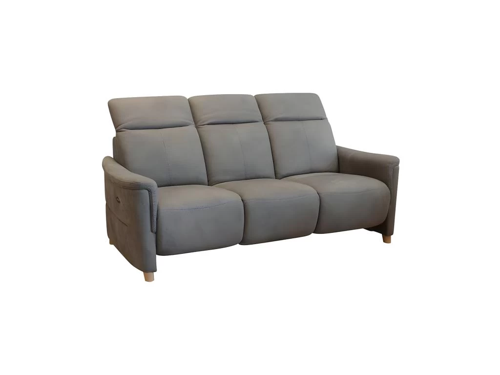 Ce canapé 3 places, muni de 2 places de relaxation électrique, propose un look contemporain mis en valeur par une surpiqure contrastée et un piétement en bois naturel, le revêtement microfibre teinte gris taupe offre le rendu visuel d’un cuir grainé tout en bénéficiant d’une très grande résistance aux rayures complétée par un entretien des plus aisés.