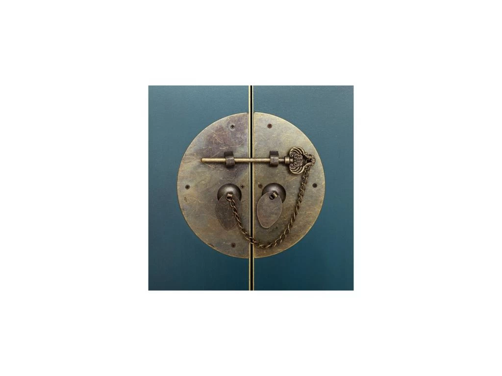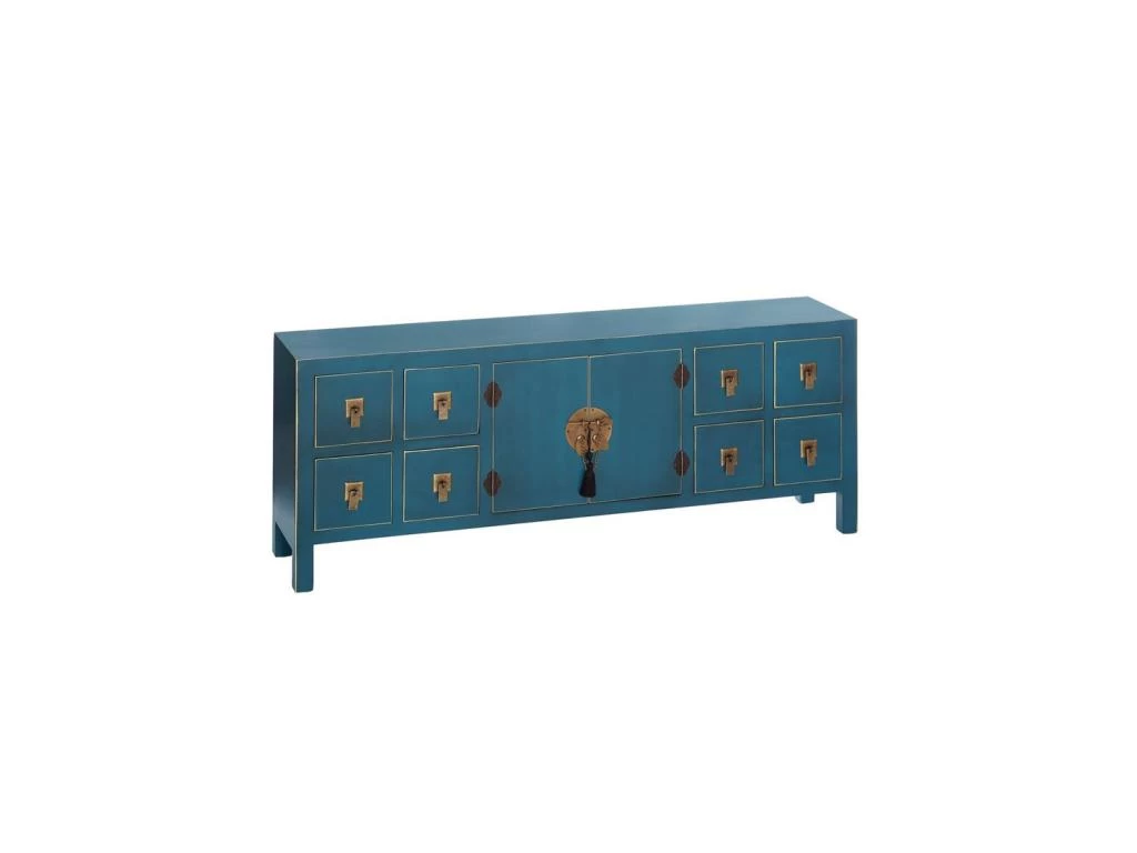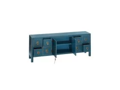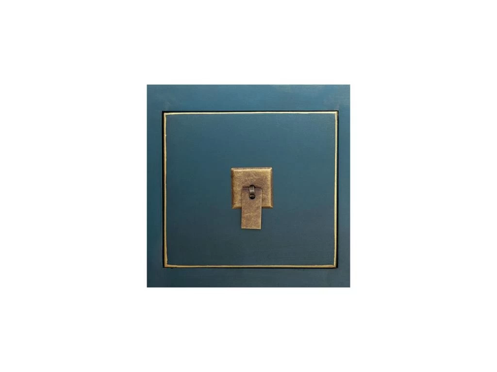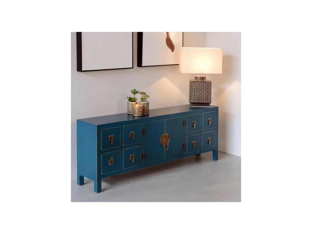 La teinte bleue se marie à la quincaillerie dorée, parfaitement raccord avec le style oriental de ce meuble multifonction sobre et élégant.