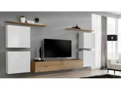 Cet ensemble est composé d’un banc TV : 180x30x40 cm avec 1 porte abattante et 3 compartiments, deux étagères murales: 120×2,2×20 cm, quatre blocs suspendus: 60x60x30 cm avec une porte pleine et 1 étagères à l’intérieur.