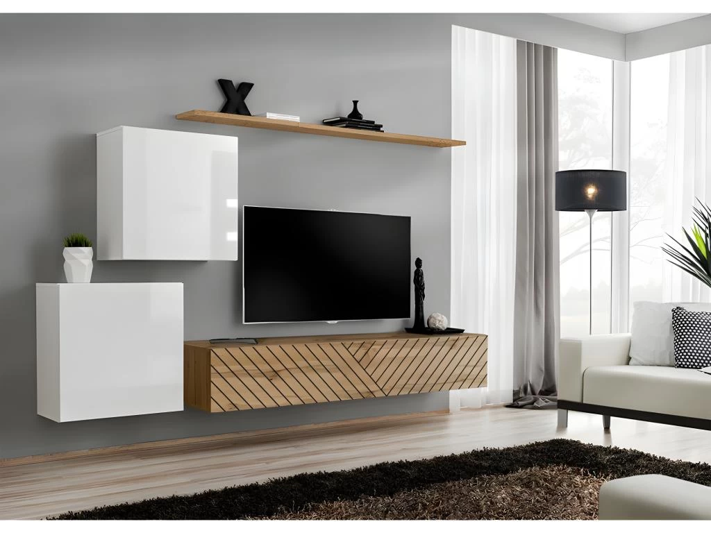 Cet ensemble est composé d’un banc TV : 180x30x40 cm avec 1 porte abattante et 3 compartiments, une étagère murale: 180×2,2×20 cm, deux blocs suspendus: 60x60x30 cm avec une porte pleine et 1 étagères à l’intérieur.