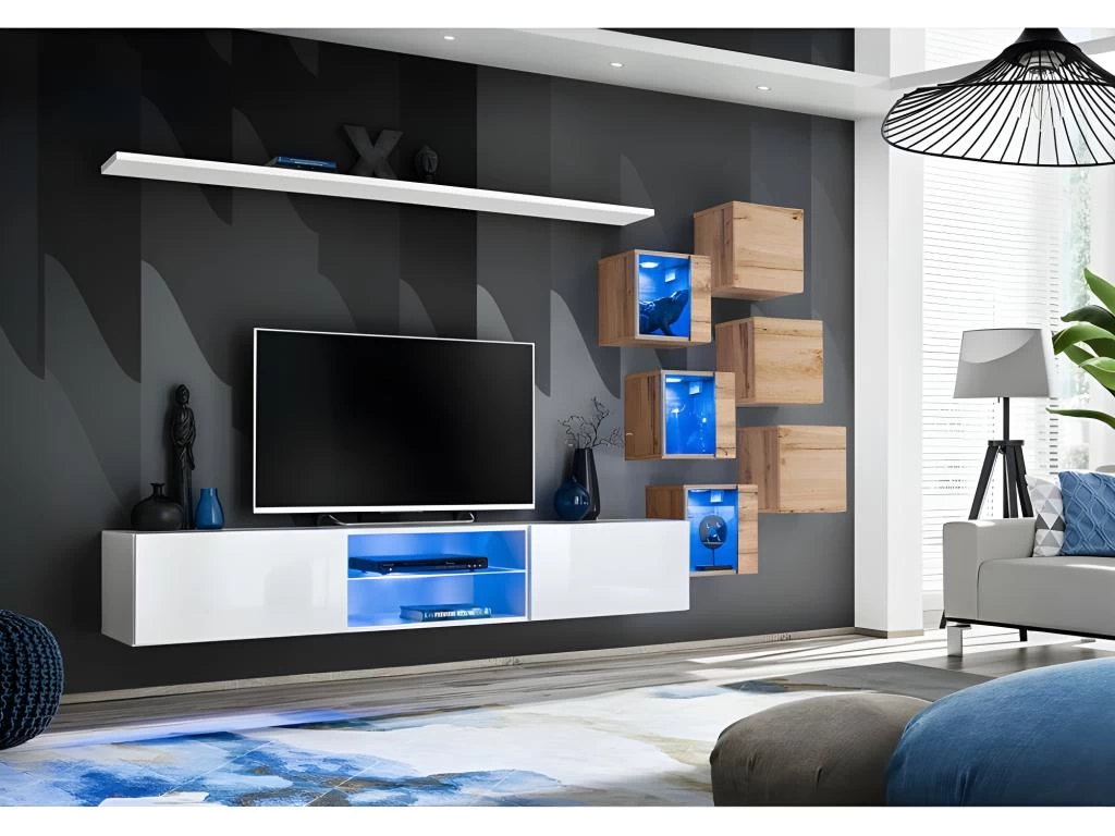 GrĂące Ă cette composition murale de la collection SWITCH, coloris blanc et chĂȘne, offrez Ă votre salon un style ultra chic, au top des derniĂšres tendances dĂ©co. Cet ensemble de meubles est Ă©quipĂ© d’Ă©clairages LED placĂ©s Ă l’intĂ©rieur des meubles vitrĂ©s, sublimant ainsi vos plus beaux objets dĂ©coratifs. PrĂ©sence Ă©galement du systĂšme « push to open » intĂ©grĂ© aux portes.