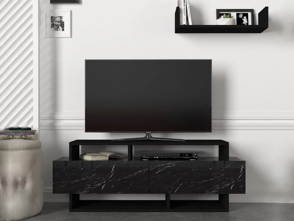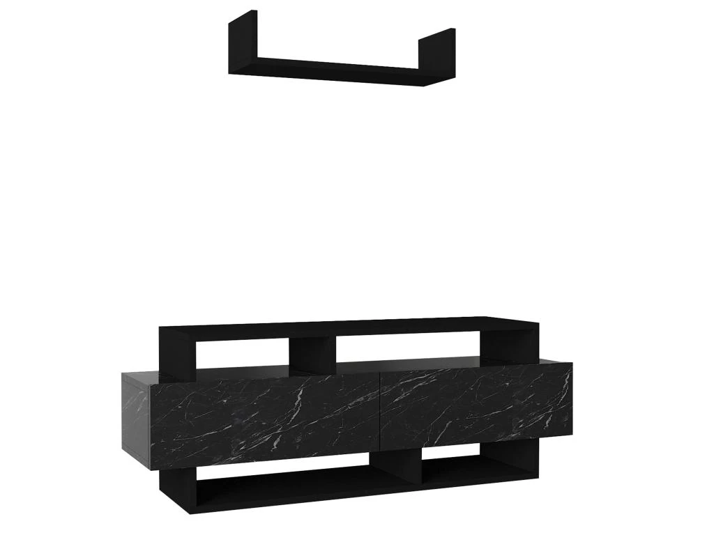L’ensemble TV IBARIA est idéal pour créer un petit espace télé organisé. Avec ses différents types de rangement vous pourrez aussi exposer des objets décoratifs. Son coloris effet marbre noir en fait un meuble parfaitement au goût du jour.