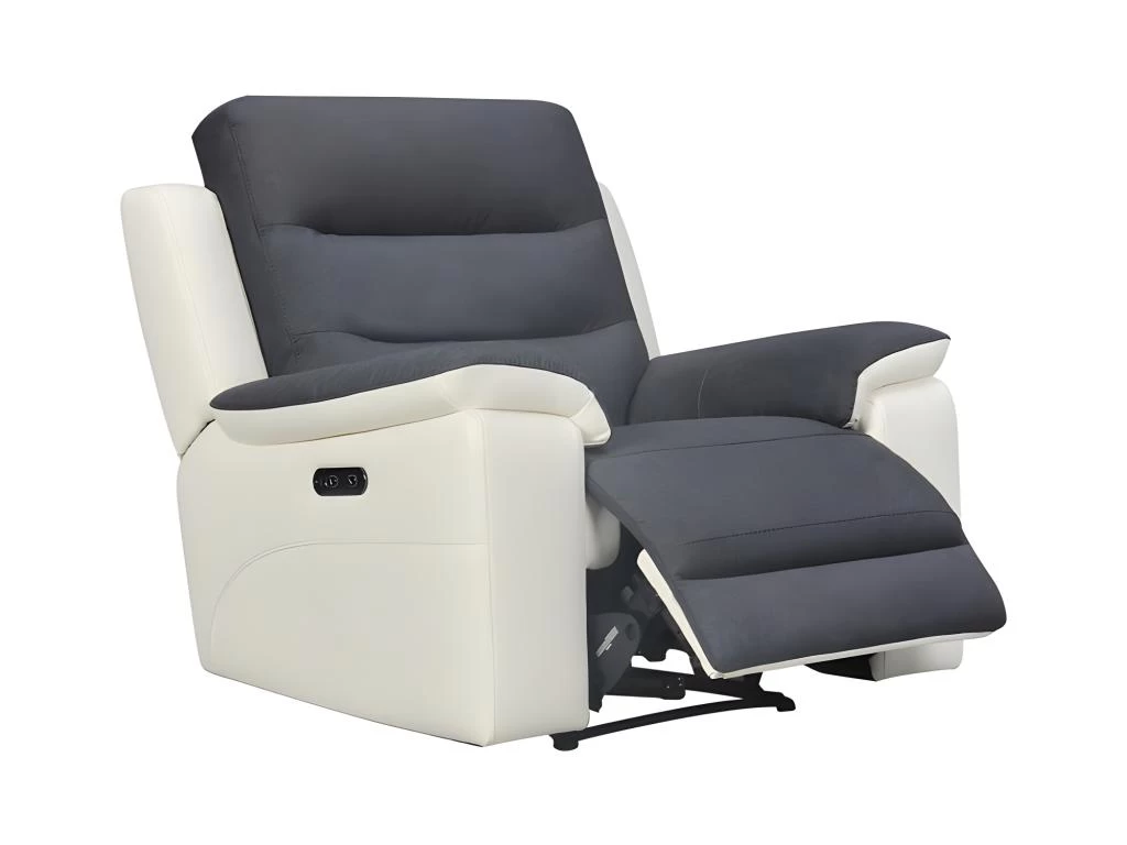- 1 place relaxation motorisĂ©e. Commande situĂ©e sur le cĂ´tĂ© de l’accoudoir + prise USB. Accueil moelleux ultra confortable. Tissu effet suĂ©dine gris et similicuir blanc pour un look bi-matière chic et tendance. Finitions soignĂ©es, matières de haute qualitĂ©, confort assurĂ©.