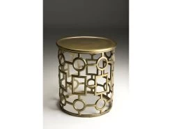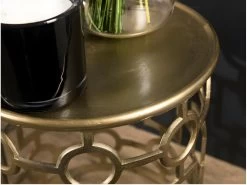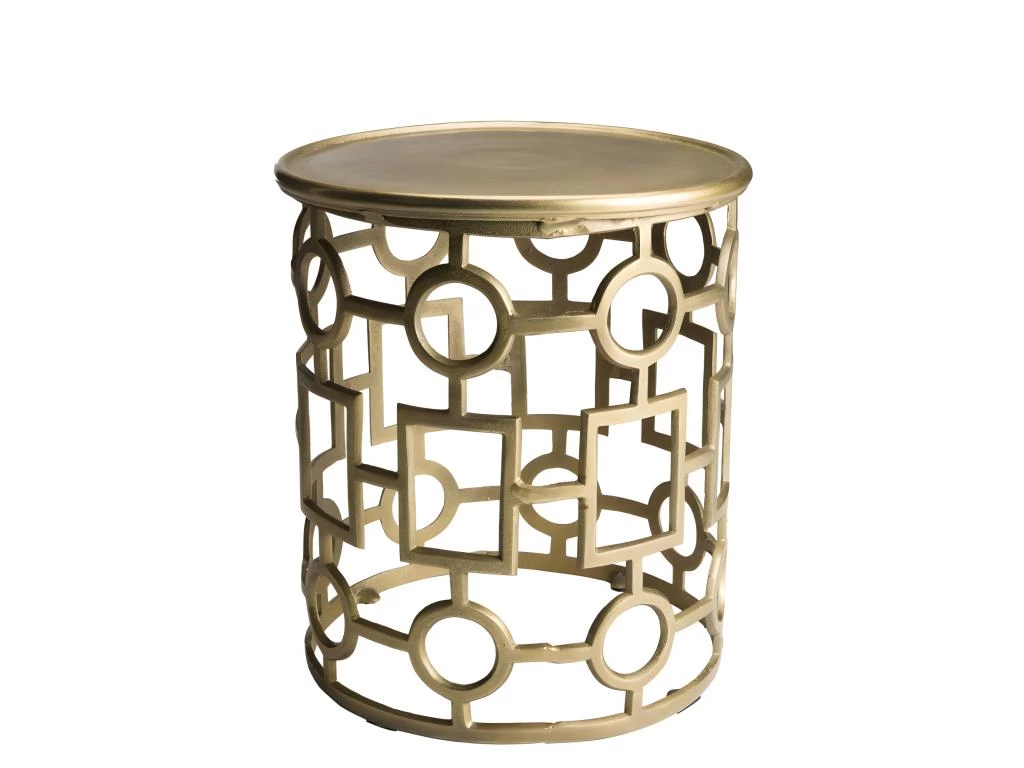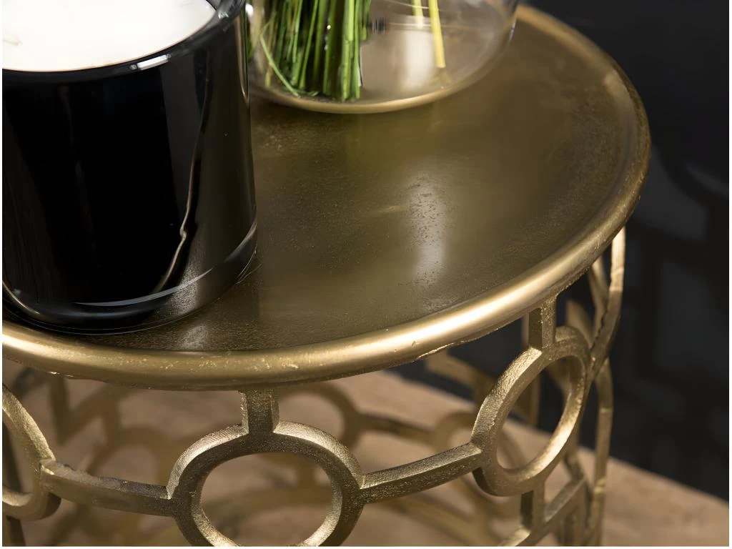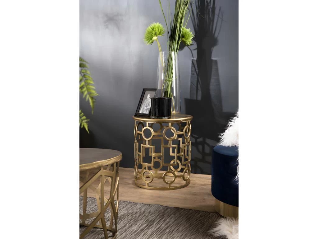 Table d’appoint ronde 43 x 43cm aluminium doré piétement graphique. Dimensions : 43 x 43 x 48 cm. Article en Aluminium. Collection indéfinissable tellement elle resplendit par la noblesse de sa matière. En un clin d’œil, cette gamme aux allures orientales illuminera votre intérieur avec sa couleur dorée et argentée.