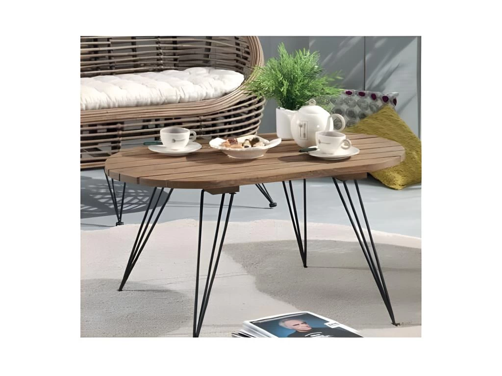 Table basse de salon design de style scandinave avec un plateau en bois (manguier) et des pieds en acier noir mat.