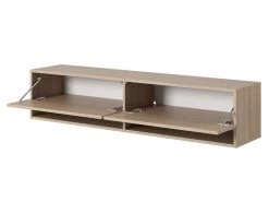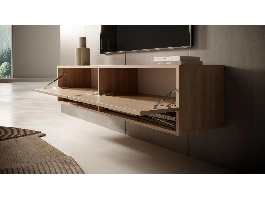 Le meuble TV Mirrgo se caractĂ©rise par une forme simple et deviendra avec succĂšs une piĂšce maĂźtresse de la piĂšce. L’une des forces de ce meuble est sa capacitĂ© – 2 armoires verrouillables permettront de cacher tous les jeux de la console, les cĂąbles supplĂ©mentaires ou d’autres petits objets pour lesquels il n’y a gĂ©nĂ©ralement pas assez de place dans la piĂšce. Les 2 Ă©tagĂšres ouvertes placĂ©es en dessous seront une cachette parfaite pour un dĂ©codeur, une console ou un livre en cours de lecture.