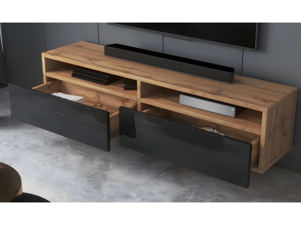 Rednaw est un meuble tv contemporain qui donnera une touche moderne Ă votre intĂ©rieur. ĂquipĂ© de deux niches ouvertes et de deux tiroirs pratiques, ce meuble aux lignes minimalistes contiendra facilement tout votre Ă©quipement tv. InstallĂ© sur votre mur ou posĂ© au sol, ce produit design mĂ©tamorphosera votre salon. Dites au revoir Ă votre coin multimĂ©dia poussiĂ©reux et permettez Ă lâharmonie dâentrer dans votre intĂ©rieur avec le meuble tv Rednaw !