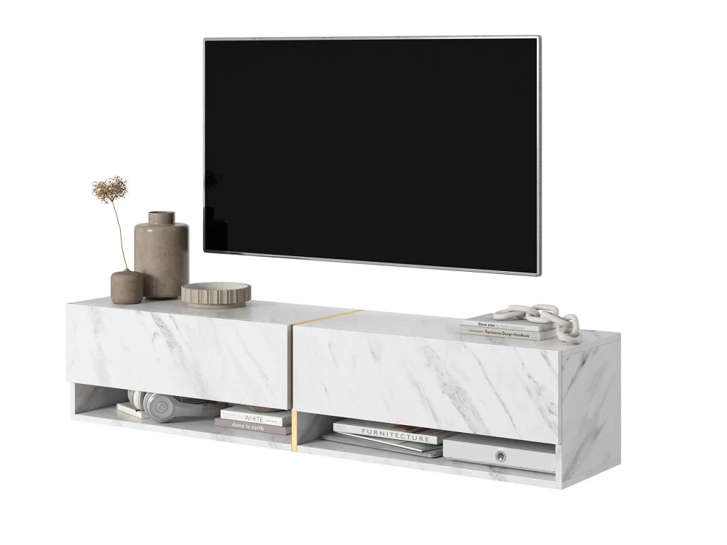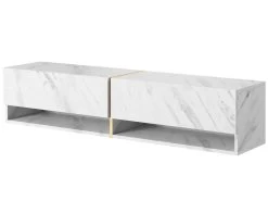 Le meuble TV Mirrgo se caractĂ©rise par une forme simple, enrichie d’une couleur tendance imitant le marbre. Grâce Ă un insert vertical dorĂ© au milieu de l’unitĂ©, l’ensemble est très Ă©lĂ©gant et deviendra avec succès une pièce maĂ®tresse de la pièce. L’une des forces de ce meuble est sa capacitĂ© – 2 armoires verrouillables permettront de cacher tous les jeux de la console, les câbles supplĂ©mentaires ou d’autres petits objets pour lesquels il n’y a gĂ©nĂ©ralement pas assez de place dans la pièce. Les 2 Ă©tagères ouvertes placĂ©es en dessous seront une cachette parfaite pour un dĂ©codeur, une console ou un livre en cours de lecture.