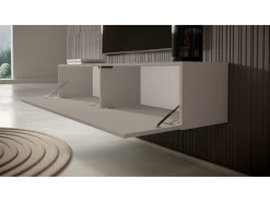 Le meuble TV Veldio combine le minimalisme avec une touche de design sous la forme d’un passepoil tendance. La façade biseautée confère à l’ensemble un caractère non conventionnel – associé à une grande plante colorée, ce meuble aura vraiment fière allure.L’intérieur a été divisé en deux armoires spacieuses, qui accueilleront avec succès aussi bien vos accessoires d’équipement audiovisuel que les documents importants que vous devez toujours avoir à portée de main. Si vous tenez à personnaliser votre pièce, les souvenirs de famille ou les photographies importantes trouveront sans aucun doute leur place sur le large plateau du meuble.