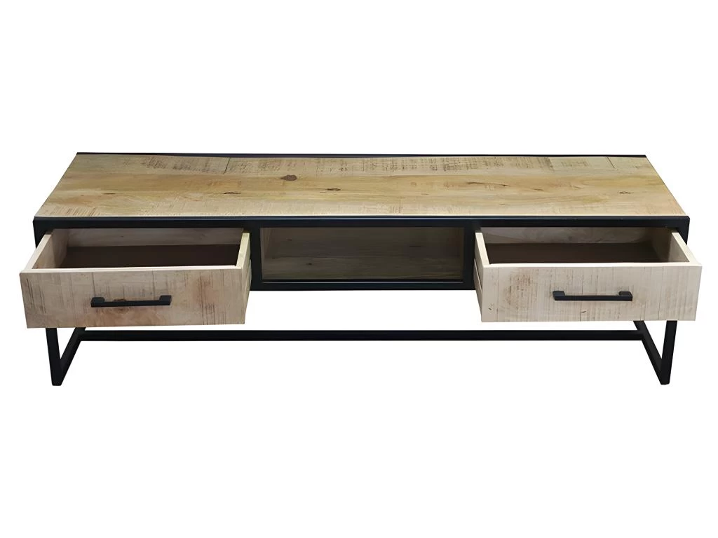 Adoptez un style industriel pour votre salon avec ce meuble TV 2 tiroirs 1 niche. Le mĂ©lange du bois de manguier massif et du mĂ©tal apporte un charme rĂ©solument dans l’air du temps. La niche centrale ne dispose pas de fond, pour un passage facile et discret des câbles. PoignĂ©es en mĂ©tal. Ne nĂ©cessite pas de montage. Dimensions : L. 140 x l. 45 x H. 40 cm. Poids : 30,6 kg. Matière : Bois de manguier et mĂ©tal. Marque : Le DĂ©pĂ´t Bailleul.Â