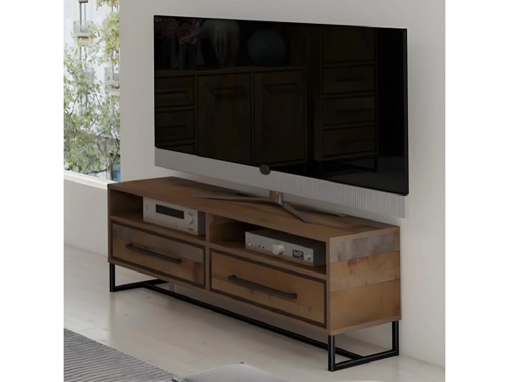 Meuble TV Devine 2 tiroirs + 2 niches, style très affirmĂ© dans cette collection avec son coloris Ă nombreuses nuances alĂ©atoires et ses piĂ©tements en mĂ©tal. Coloris chĂŞne barnwood, chĂŞne très nuancĂ© du clair au foncĂ©, façon vieux bois. A monter soi-mĂŞme. En fibres de bois, panneaux Ă©pais (MFC). Dimensions 130×45 cm, hauteur 48 cm. Poids 41 kg. (1 colis)