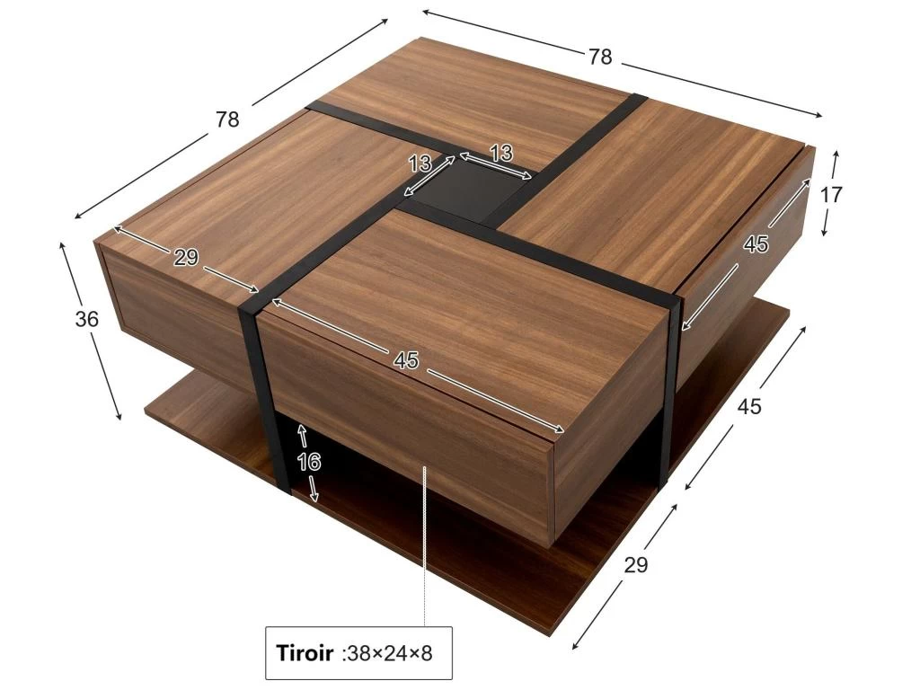 Notre table basse sĂ©duit par sa forme carrĂ©e particulière et illumine n’importe quelle pièce. Quatre tiroirs coulissants offrent un rangement discret pour vos objets personnels et gardent vos surfaces bien rangĂ©es.Â