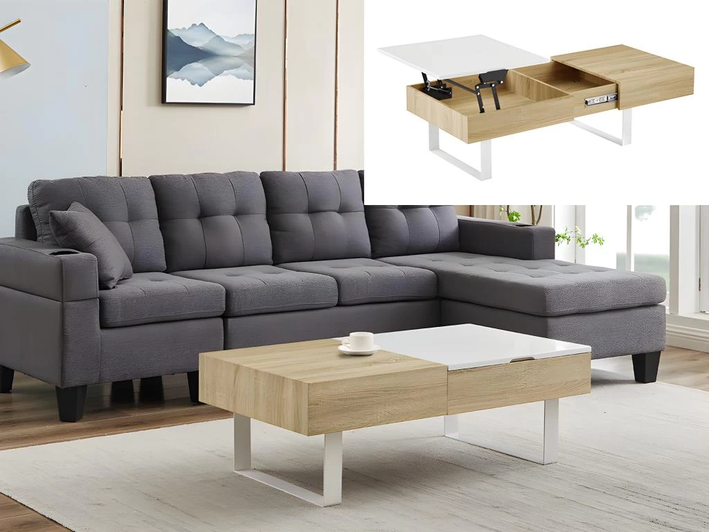 N’attendez plus pour choisir la table basse BALUN ! Avec son système de rangement intĂ©grĂ© et son plateau relevable, elle s’adaptera Ă tous les espaces. Ce meuble, certes astucieux, est aussi Ă©lĂ©gant grâce Ă de belles finitions.