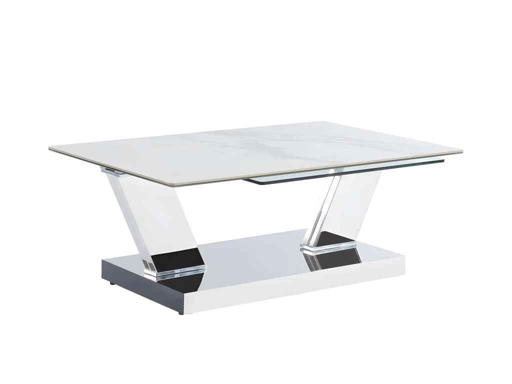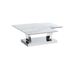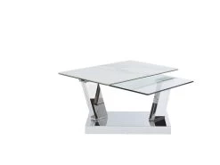 Robuste et très élégante la table basse OXANA surprendra vos convives par ses finitions exceptionnelles ! Montée sur un pied en acier poli inoxydable, cette table basse design propose deux plateaux rectangulaires pivotants à 360° l’un en verre trempé transparent, l’autre en verre trempé surmonté d’un second plateau en céramique pour apporter une finition aussi sophistiquée que résistante à l’épreuve du temps. Très pratique, cette table se module et s’allonge pour atteindre jusqu’à 150cm de longueur.
