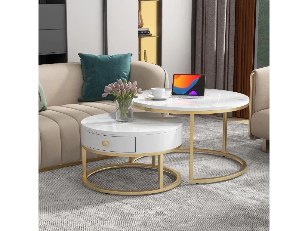 Ce lot de table basse ronde sophistiquĂ© et luxueux comprend 2 tables qui s’emboĂ®tent pour que vous puissiez facilement les placer ensemble ou les utiliser individuellement. Petit et lĂ©ger, facile Ă dĂ©placer et Ă transporter, vous pouvez rĂ©partir ces tables basses individuellement dans la pièce ou les emboĂ®ter pour un cafĂ© et des collations faciles. La combinaison d’un motif en marbre brillant et d’un cadre dorĂ© sera le point culminant de votre maison.