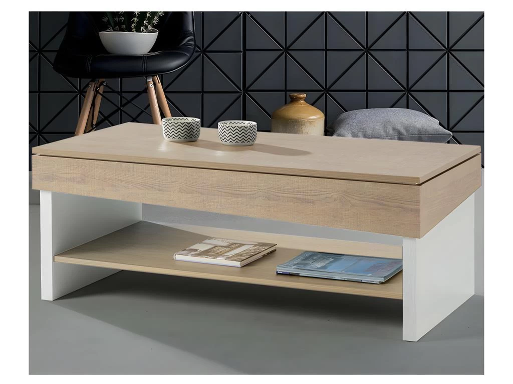 Le dessin moderne de cette table basse met en avant le mariage d’un revĂȘtement chĂȘne blond et de bois blanc.