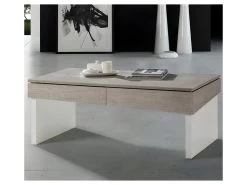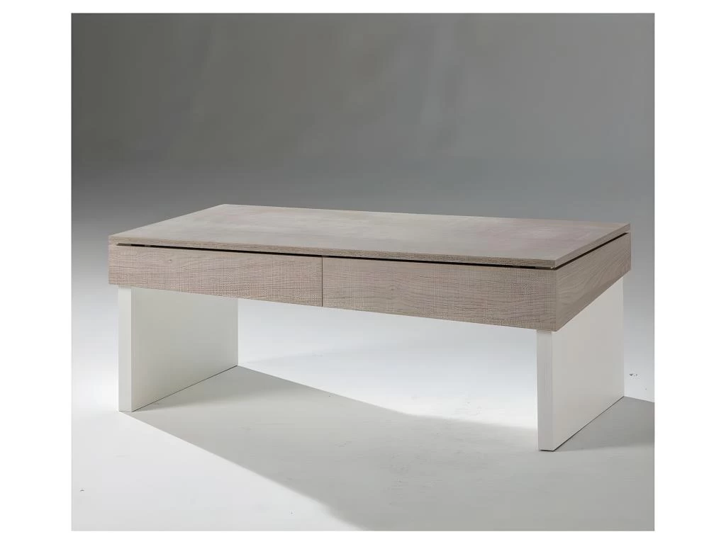 Le dessin moderne de cette table basse met en avant le mariage d’un revĂȘtement chĂȘne clair et de teinte blanche.